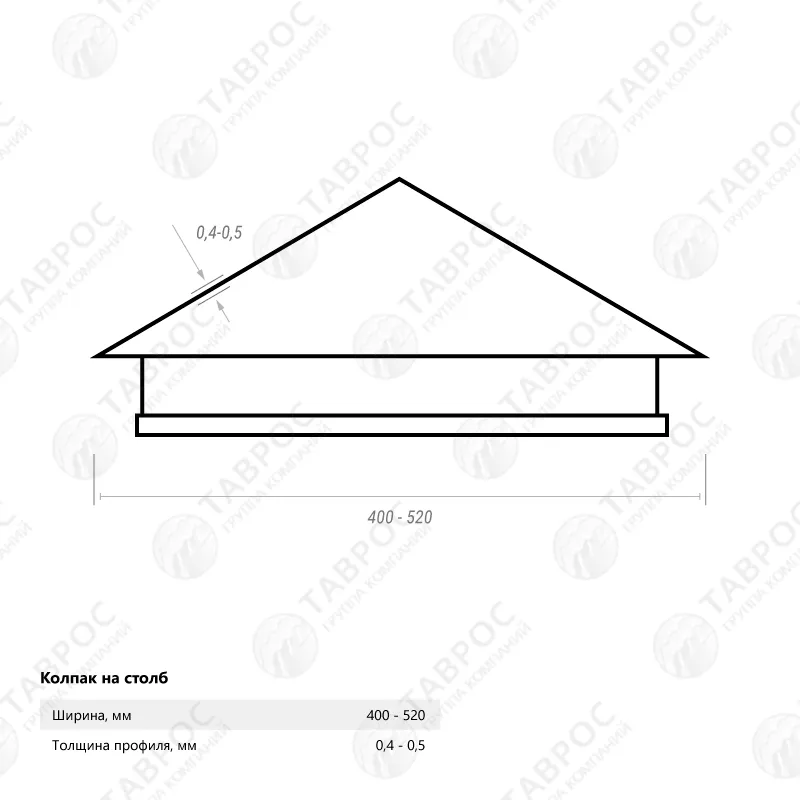 Колпак на кирпичный столб это металлическое изделие, устанавливаемое в качестве оголовка на опору забора. Колпак защищает кладку столба от негативного влияния атмосферных осадков и придаёт ограждающей конструкции привлекательный вид. Для производства колпака используется тонколистовая оцинкованная сталь с полимерным покрытием в цветах по каталогу RAL. Производятся колпаки, как правило, в трёх типоразмерах посадочных мест: 400×400мм, 400×520мм и 520×520мм. При необходимости возможно изготовление изделий по индивидуальным размерам.