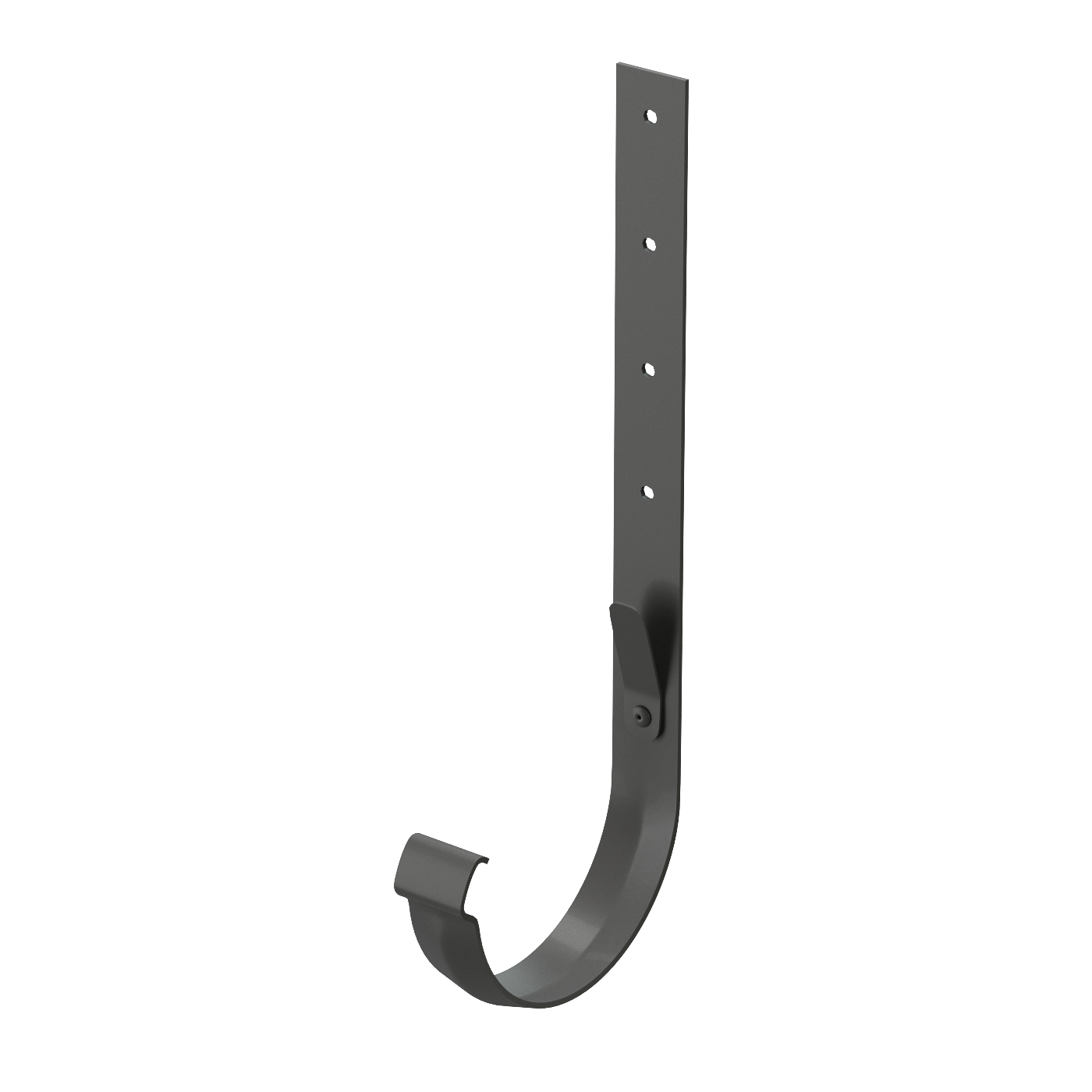 Металлические кронштейны для желоба, они же держатели применяются в том случае, когда крепление производится на обрешетку, сплошное основание или стропила, но не на лобовую доску. Длина опорной части кронштейна – 300 мм.