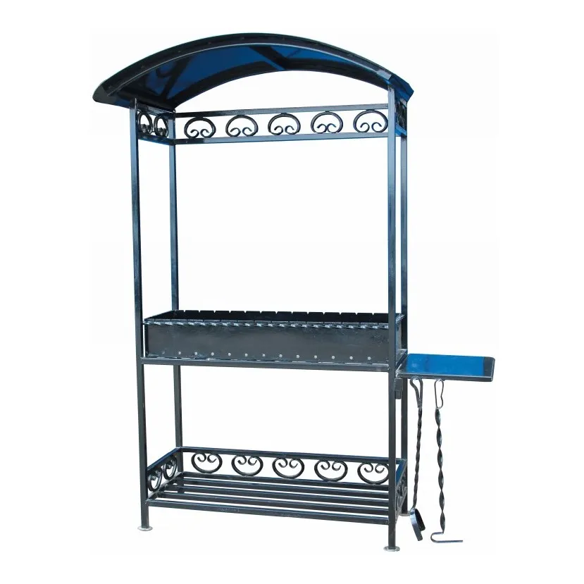 Это средний по габаритам стационарный мангал, однако относительно небольшой вес все - таки позволяет перемещать его по участку в нужную зону. Изготовлен из профтрубы 25х25мм и листовой стали толщиной 3мм с чёрной порошковой покраской. Максимально открытая конструкция не позволяет дыму скапливаться в рабочей зоне. Значительный размер открытой жаровни позволит успешно приготовить еду даже на большую компанию, а наличие полки для продуктов и посуды облегчит работу повару. Кроме того, нижнюю площадку можно использовать как дровницу. Такой элемент как крыша над мангалом позволит защитить рабочую зону от лёгких осадков. В комплекте с мангалом идут совок и кочерга. Простая, но в то же время продуманная и удобная конструкция всегда поможет Вам прекрасно отдохнуть на свежем воздухе.