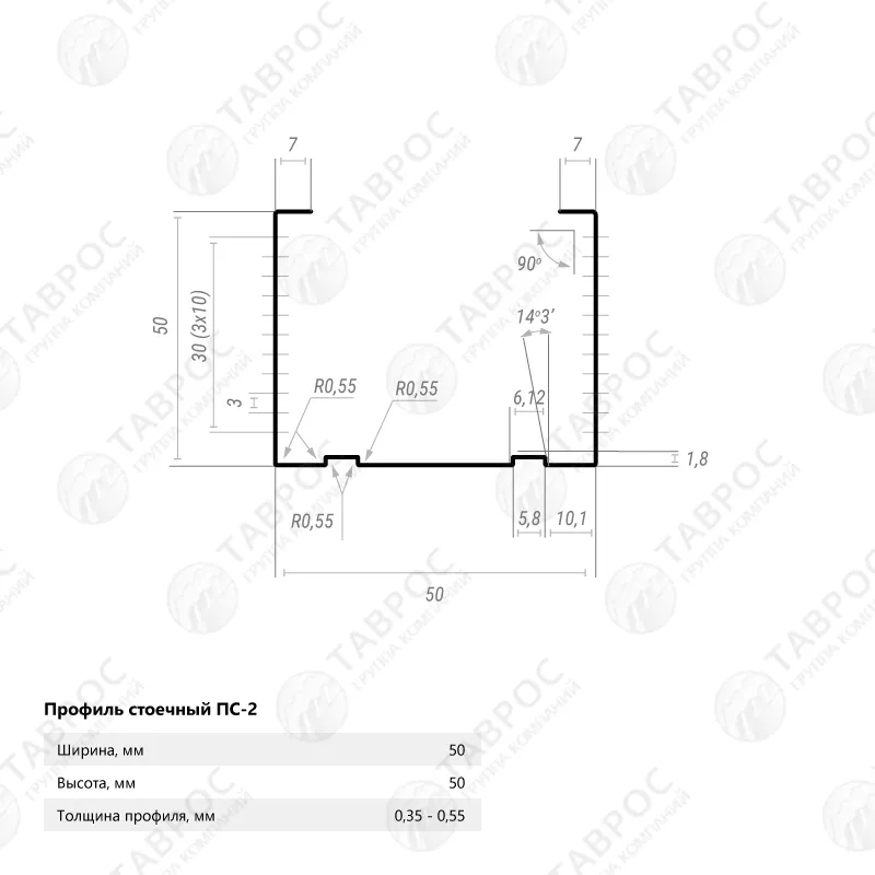 Профиль 100х50 мм. Размер стенок позволяет расположить внутри утеплитель. При использовании стекловаты каркас позволит избежать избыточной напряженности, защищая гипсокартон от деформации. Средняя допустимая высота конструкции – 4,7 м.
