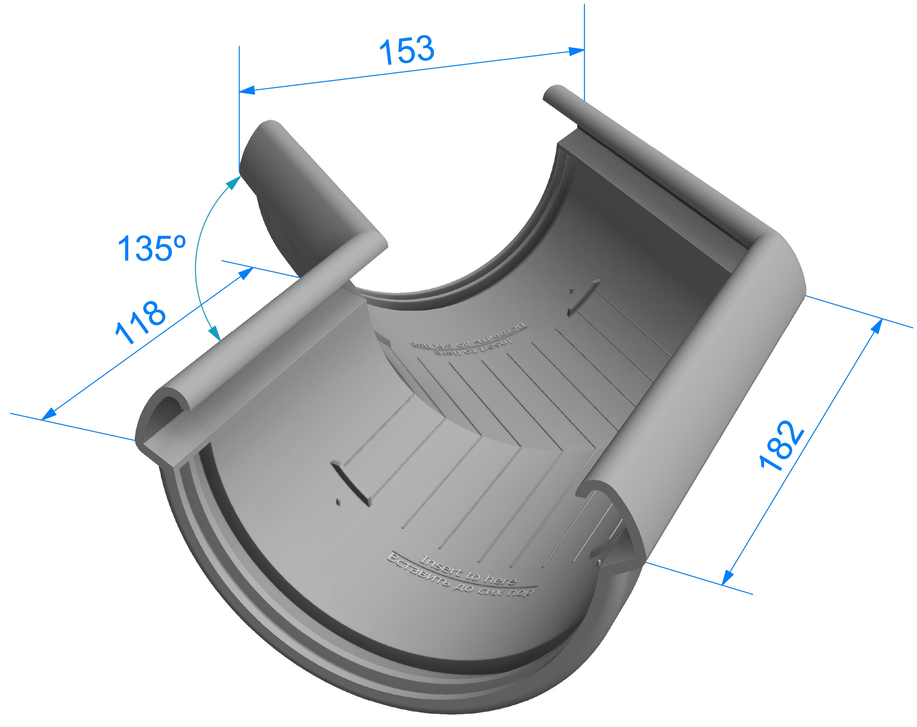 Устанавливается на внешних и на внутренних углах кровли и предназначен для соединения желобов под углом 135° в целях изменения направления движения воды.